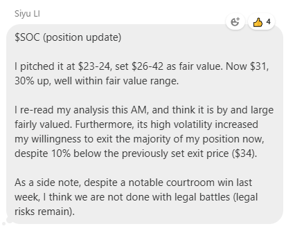 Exit SOC: a ~30% gain since June 2025 write-up. Exited after the July court room win, and shared my thoughts. Looking back, I had lucky exit timing, as the stock has since given back all its gains, with the market nervous about the recent AB 1448 bill passing through the CA senate. IMO, the issue with Sable isn't any particular bill, but a continuous, organized effort to deter Sable, at all costs, for an ideology-driven belief. If one wants to hold it as a long term investment, i think you must have peace with that.
