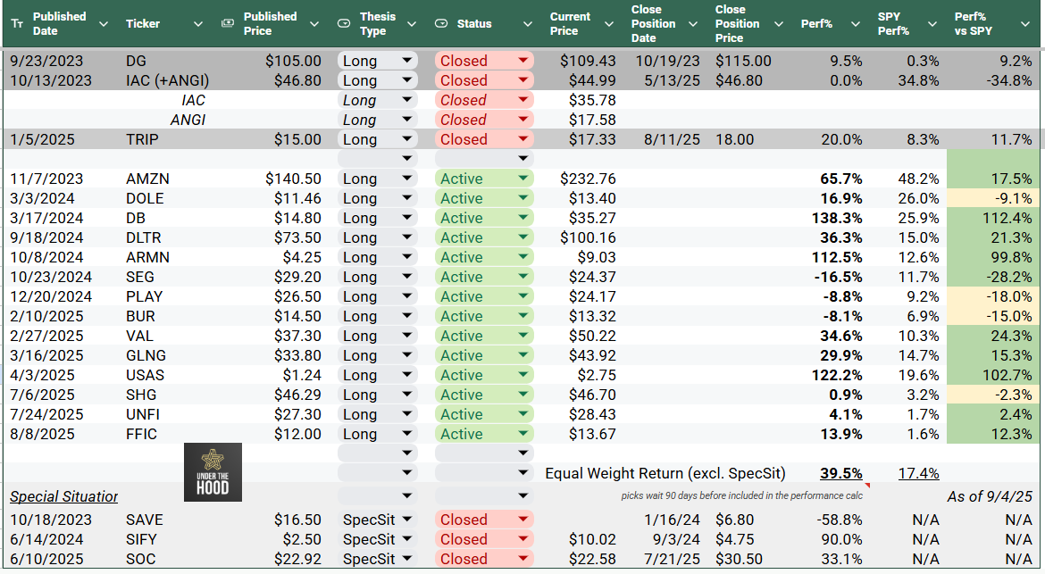 The table captures the performance (as of 9/4/2025) of all UTH-published ideas since inception in September 2023. 14 active long ideas.
