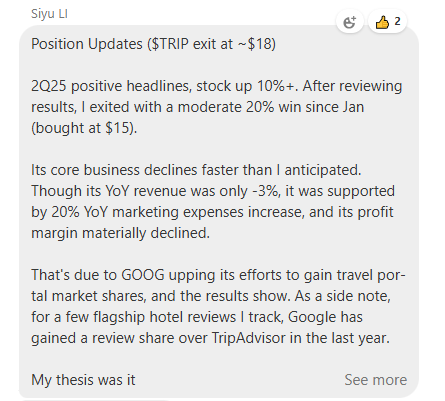 Exit TRIP: a moderate 20% gain since its first feature in Jan 2025, exited after 2Q25 earnings, and shared my thoughts on the Substack Chat: